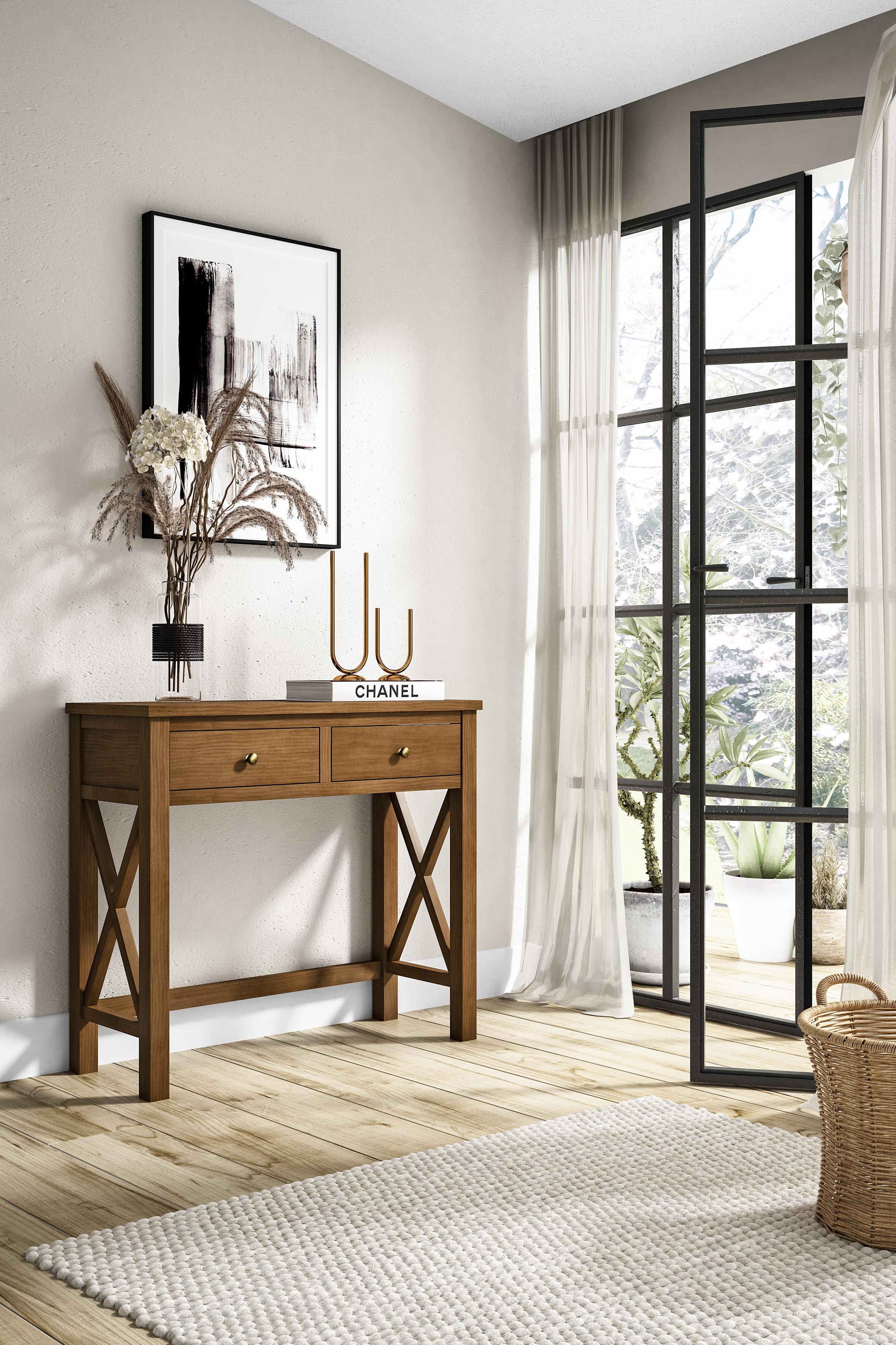 La consola Milo de 90 cm, con 2 cajones y un diseño de cruceta, combina estilo y funcionalidad, ideal para cualquier habitación.